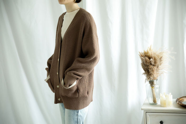 袖口が二重構造になっている、ゆったりと着れるサイズ感のニットカーディガンです。